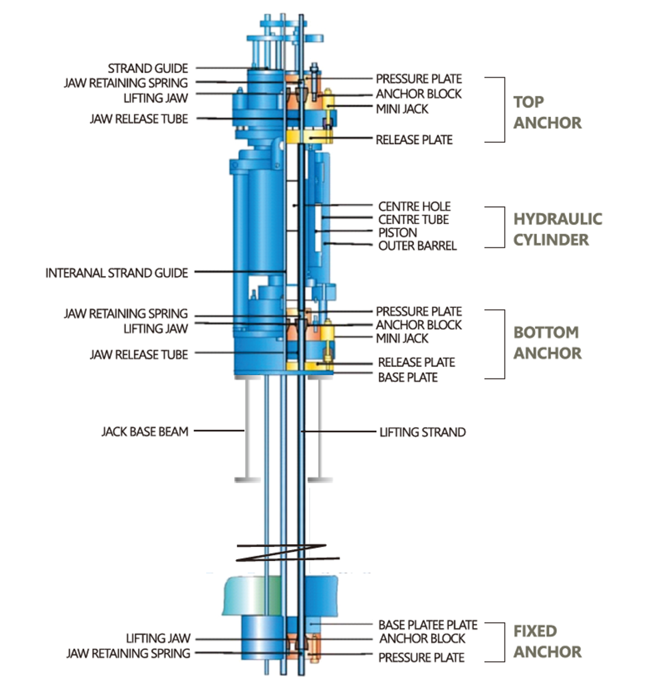 스트랜드 잭은 상부와 하부 두 개의 웻지(Lifting Jaw)를 사용하여